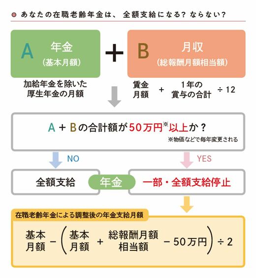 60歳以降、厚生年金に加入して働きながら受け取る年金のことを「在職老齢年金」といいます。在職老齢年金として受け取れる金額は、給与と年金の合計額が「50万円」を超えるか、超えないかで決まります。