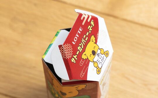 オリジナルとしての価値を発揮できるように、プロダクトに工夫を凝らしているのも見逃せない。特筆すべきはふたの部分だ。通常のコアラのマーチは、横にミシン目が入っていてピリピリと破って開けなくてはならないが、オリジナルコアラのマーチはふたをあえてのり付けせず、ツメで閉めるタイプにしている。