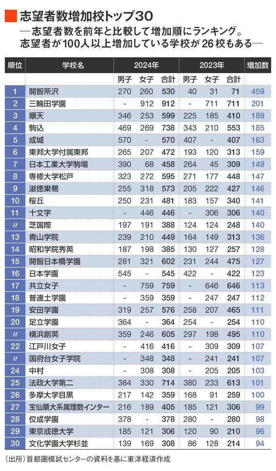 この表は、首都圏模試センターが2024年7月に実施した模擬試験を受けた6年生が、志望校として名前を入れた学校の志望者数の総数を前年度同月の数字と比較したものです。首都圏模試センター取締役教育研究所長の北一成氏いわく、「各学校の人気傾向がダイレクトに反映されている」データです。