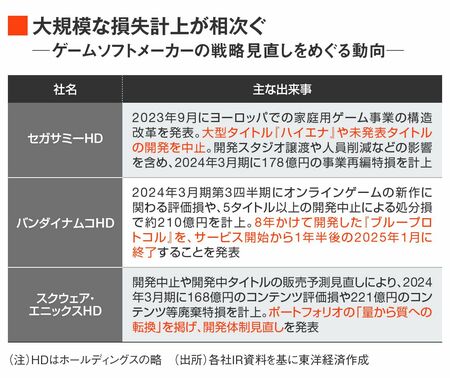 ソニー・インタラクティブエンタテインメント(SIE)傘下のスタジオが8年かけて開発したとされるシューティングゲーム「コンコード」は、2024年8月のリリースからたった2週間でサービス終了となった。セガも2023年9月に、大型タイトル「ハイエナ」の開発を中断。スクウェア・エニックスHDは複数のタイトルの開発中止により、過去最大となる約220億円の特別損失を2024年3月期に計上した。