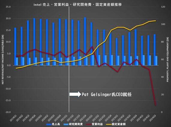 確かにインテルの業績は厳しい状況が続いている。図1は四半期ごとの売上高、営業利益、研究開発費、固定資産額の推移を示している。ゲルシンガー氏が就任して以降、積極的な設備投資に反し売上高は減少。安定していた利益も低下し、2024年7~9月期には大規模なリストラなどに伴う引当を行い過去最大の赤字となった。この間、工場投資とともに固定資産額は増え、開発も減らすことはせずにアクセルを踏み続けたことになる。