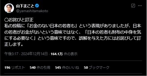 私の投稿に「お金のない日本の若者も」という表現がありましたが、日本の若者がお金がないという意味ではなく、「日本の若者も財布の中身を気にする必要なく」という意味ですので、誤解を与えた方にはお詫びして訂正します。