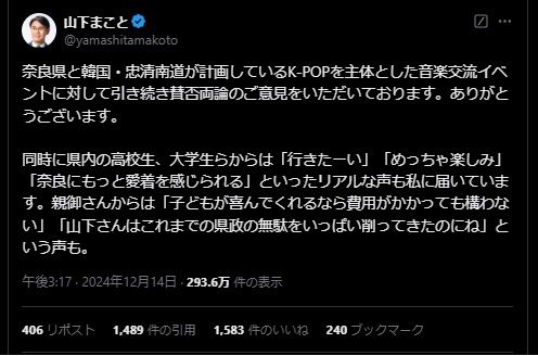 今回のライブ開催に関する、「歴史も伝統もある奈良県が、(日本的なイベントではなく)K-POPのライブを行うのか?」「県民にお金を回すことを優先すべきではないか」という声も、やはり一定の支持を得ているようには見える。