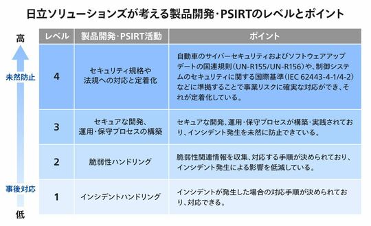 だが、どこから手をつければいいのか、誰が担当すべきかわからないという企業も多いはずだ。そこで日立ソリューションズでは、企業がPSIRTを構築する際の4段階のレベルを提示している。