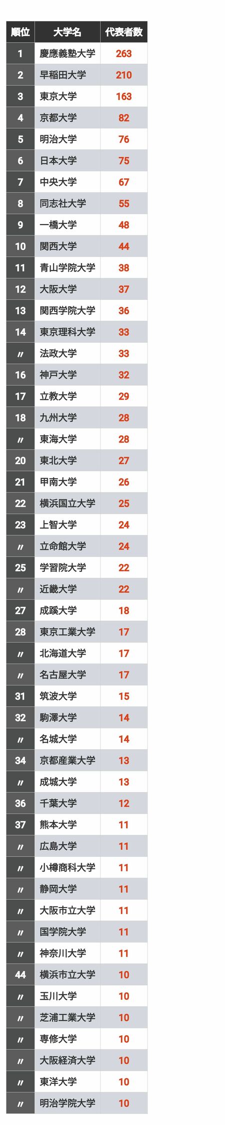 首位はビジネス界に強いとされる慶應義塾大学、続いて早稲田大学が2位に続いた。東京大学は3位、そして学生数の多いマンモス大学である日本大学も6位に食い込んだ。