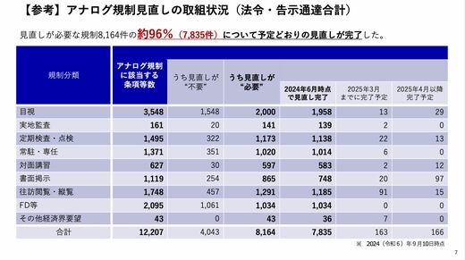 この時点ではそこから2025年6月までの3年間を集中改革期間としたのだが、その後就任した河野前デジタル大臣の意向もあり締切は1年前倒しの2年間に。現場は大変な苦労があったようだが、約1万の条項がチェックされ、そのうち見直しが必要とされた8164件のうち、約96%にあたる7835件を期限である2024年6月までに見直しが完了したと、このたび発表された。これにより3.6兆円の経済効果があるとの見通しだ。