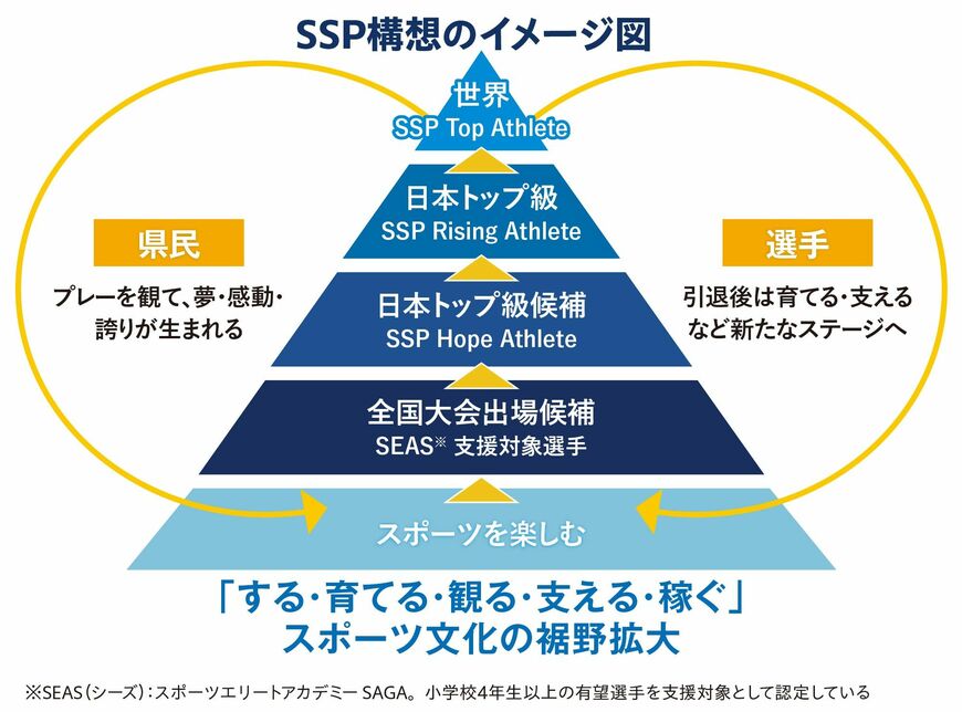 SSP構想とは、山口氏が知事就任前から考えていたものをベースに、18年に佐賀県でスタート。世界に挑戦する佐賀ゆかりのトップアスリートの育成を通じて、スポーツ文化(「する」「育てる」「観る」「支える」「稼ぐ」)の裾野を拡大し、さらなるアスリートの育成につながる好循環を確立することで、スポーツの力を生かした人づくり、地域づくりを進めるプロジェクトだ。