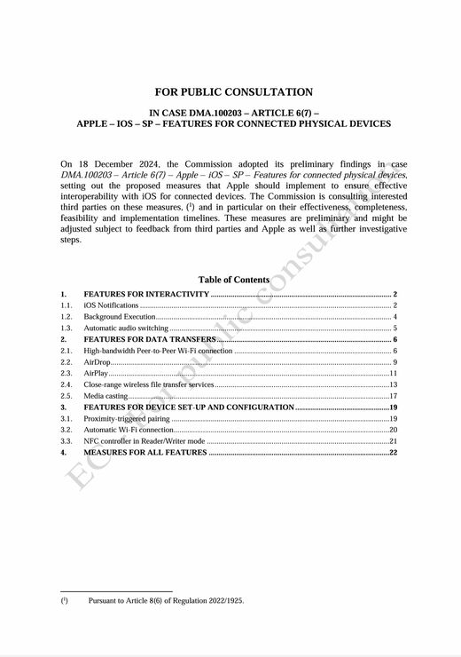 欧州委員会が12月18日に公開協議 DMA(Digital Markets Act〈デジタル市場法〉)100203案件として公開したドキュメントによると、アップルが一部のワイヤレス技術を不当に独占しており、iOSの通知や、自動Wi-Fi 7切り替え、AirDrop、AirPlay、自動オーディオ切り替えなどの技術について、オープンにするべきだと主張している。