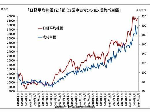 都心部の不動産価格は、日経平均株価に連動する。まさに都心3区、6区あたりのマンション価格は株価に追随する形で2024年も高騰傾向にあったが、日経平均株価が再び4万円を超えることがあれば、過去の推移からしても都心部のマンションはもう一段上昇する余地がある。