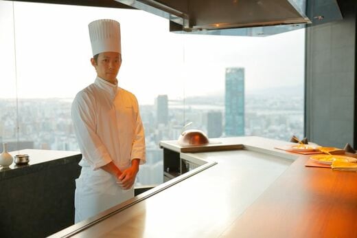そして、当然ながらラグジュアリーホテルとしての根幹である、サービス面にも力を入れている。「総料理長から総支配人になった珍しい経歴を持つ支配人の下で働いているので、食事へのこだわりは深い」と話すのは、ホテル内レストラン鉄板焼「瑞」の髙岡俊輔シェフだ。ホテルグランヴィア京都で腕を振るい、オープンと同時に大阪へやってきた。「マリオット系列ということで、“朝食のヨーグルトは数種類を”、“この食材は提供不可”といった独自のルールがあります。また、複数のマリオットをご利用いただいてきた会員の方が多く、丁寧なサービスを心がけています」。