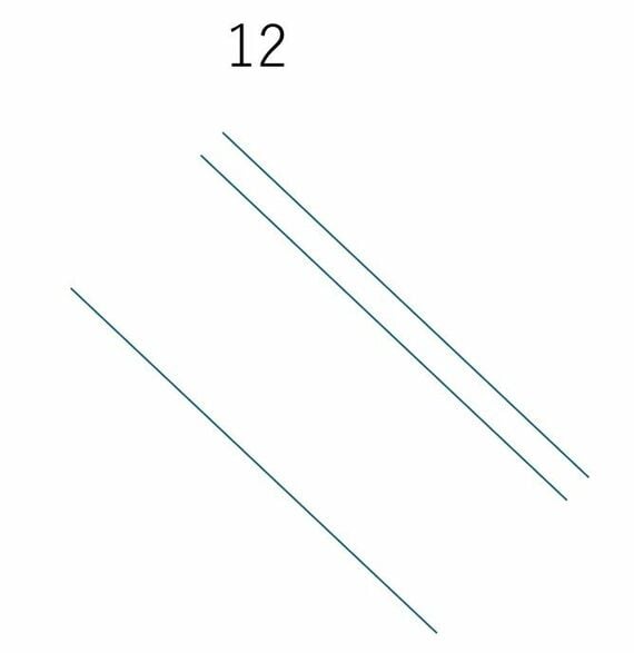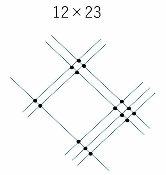 まず、12×23を考えてみましょう。インド式筆算では、12という数字を「1本の線と2本の線」で表します。このように、斜めの線を3本、少し離れた位置に書くのです。