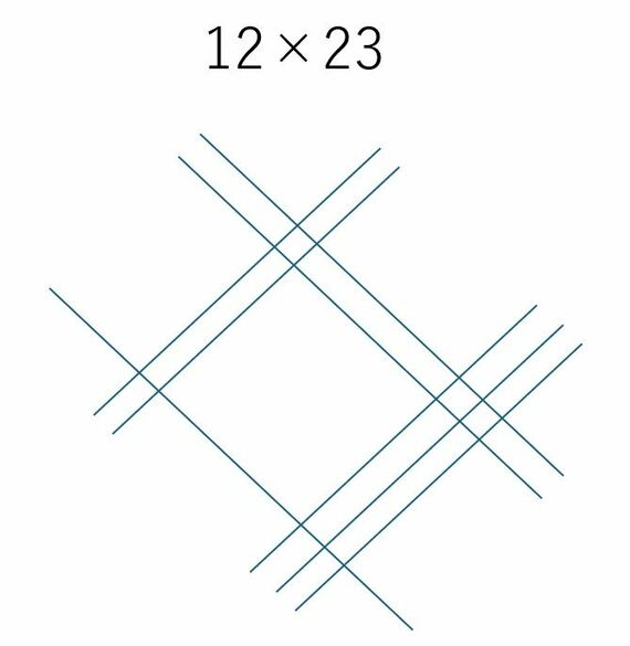そして、これと同じことを23でも行います。「2本の線と3本の線」を書くわけです。このとき、12の線と交差するように書くのがポイントです。