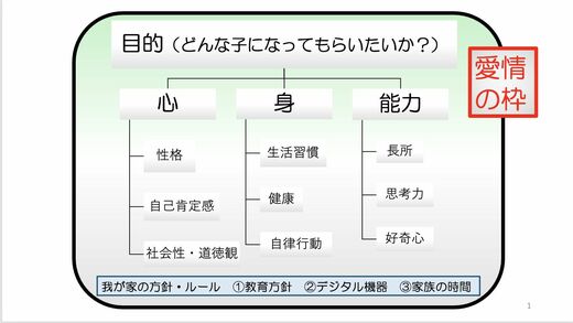 まずは「我が家が目指す子育てのゴール」を話し合います。ゴールは18歳または20歳で設定してみてください。その段階でどのような子どもになってほしいでしょうか。〇〇大学に行ってほしいというような固有名詞が出てくるようなゴールではありません。人としてどのような人になってもらいたいか、その状態をイメージして出てくるゴールです。