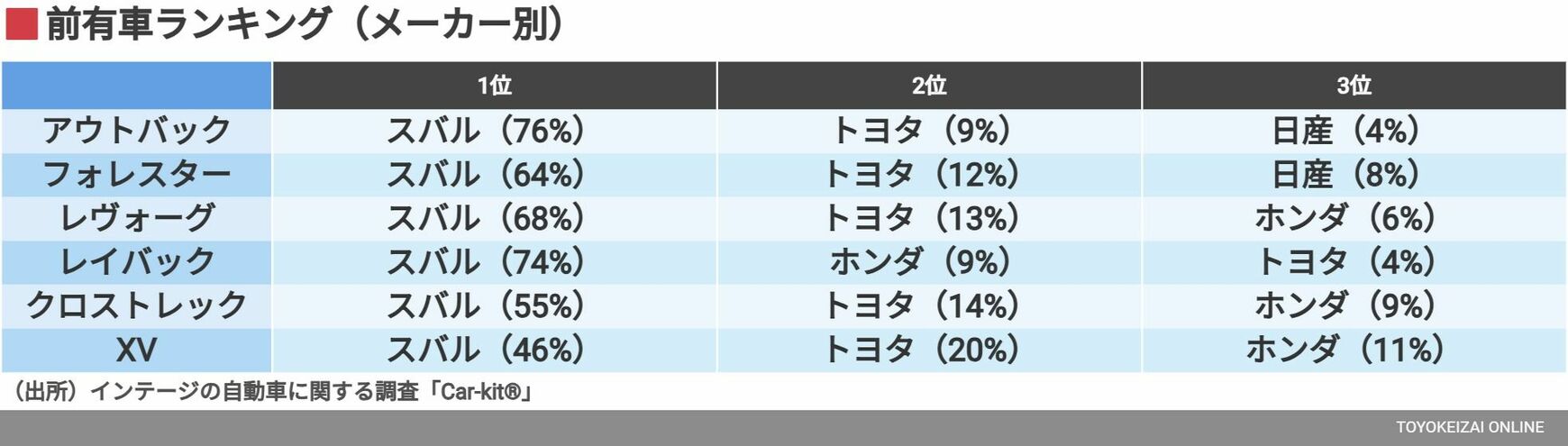 メーカー別の結果を見てみると、今回取り上げたどの車種においても、スバルからの乗り換えが圧倒的だった。