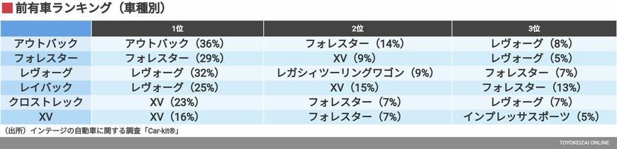 メーカー別でスバルが多かったため、当然ながら車種別で見てもスバル車が1~3位を独占している。2023年に発売された「レヴォーグ レイバック(以下:レイバック)」、2022年に発売された「クロストレック」を除き、同一車種からの乗り換えがそれぞれ1位だった。