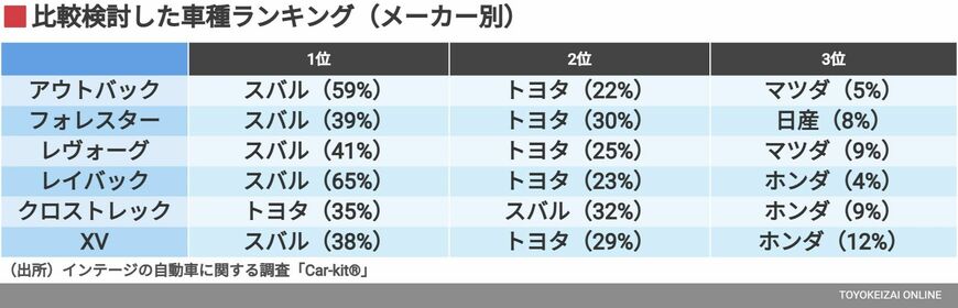 まず、ほかに「比較検討したクルマがあったかどうか」の結果を紹介すると、「比較検討したクルマがなかった=指名買い」の割合は、アウトバック:56%、フォレスター:47%、レヴォーグ:63%、レイバック:48%、クロストレック:44%、XV:53%だった。アウトバックとレヴォーグの“指名買い率”の高さが、特徴的だ。