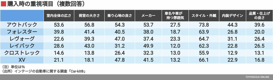 そして注目すべきは「メーカー」「車名や車が持つ雰囲気」が、ほかのスバル車より高い点である。