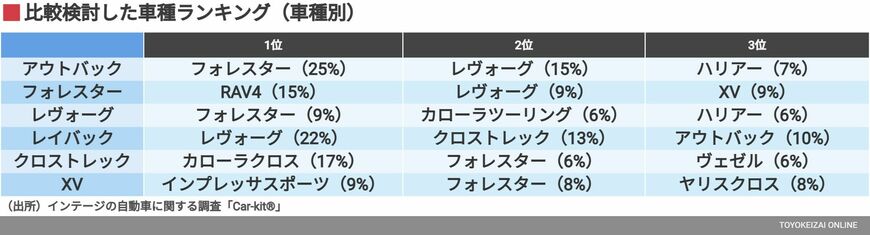 次に車種別での比較状況も見てみよう。アウトバックと比較検討されたのは1位:フォレスター、2位:レヴォーグで、3位にトヨタ「ハリアー」が入ってくる。スバル車にこだわらないSUV検討層にとって、アウトバックのライバルはハリアーとなるようだ。