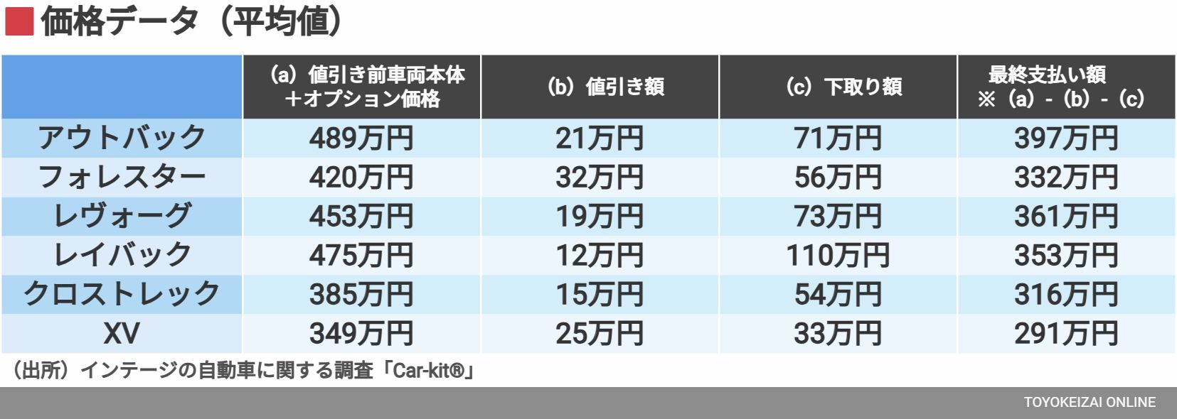 「値引き前車両本体+オプション価格」を見ると、高額な順からアウトバック:489万円、レイバック:475万円、レヴォーグ:453万円、そしてフォレスター:420万円。この金額から値引きと下取りを差し引いた「最終支払い額」は、アウトバック:397万円、レヴォーグ:361万円、レイバック:353万円、フォレスター:332万円だった。