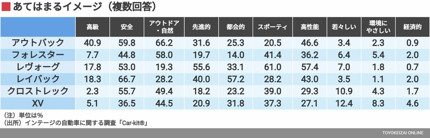 それに対して「若々しい」「環境にやさしい」「経済的」は、どの車種においても低水準であり、スバルが得意としないジャンルであることが改めてわかる。