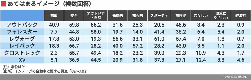 特に「高級」は他車種を大きく引き離しており、スバルの中では唯一と言える高水準だ。「安全」はどの車種も高く、スバルが「アイサイト」を長年培ってきた大きな成果であろう。