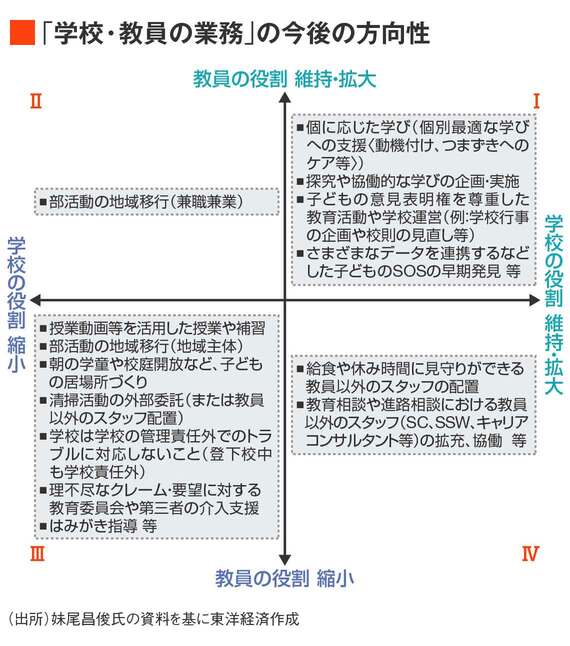 1つは、学校の役割として、現在の水準・範囲を維持・拡大するのか、それとも縮小するのか。もう1つは、教員の役割を維持・拡大するのか、縮小するのかだ。学校の役割・業務=教員の役割・業務とは限らない。学校の役割は維持しつつも、教員以外のスタッフを充実させるなどして、教員の仕事は減らすという選択肢などもある。