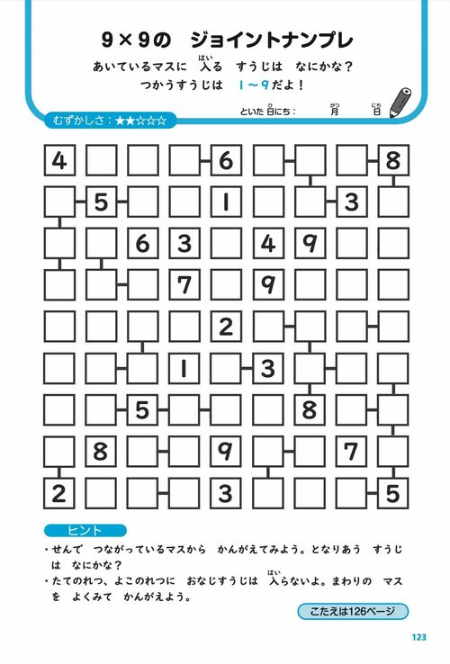 筆者が上梓した『東大式ナンプレドリル』では、さまざまな種類のナンプレを解説しています。小学生でも楽しめる問題から、大人でも悩むような難問まで幅広く問題を用意し、その問題について丁寧に解き方を説明しています。