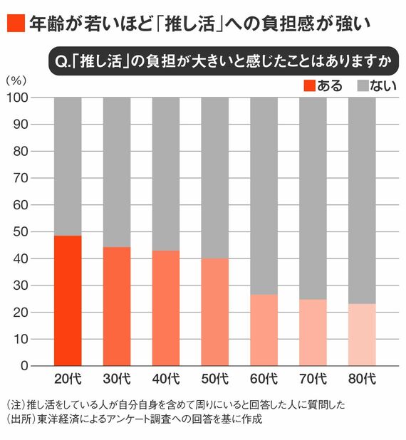 「1億総推し活ブーム」の感があるが、問題も広がりつつある。東洋経済のアンケート調査では、自分自身や周囲の人が推し活をしていると回答した人の内、約4割が推し活についての支出が経済的な負担だと感じていることがわかった(下図)。