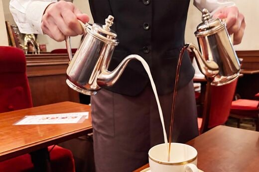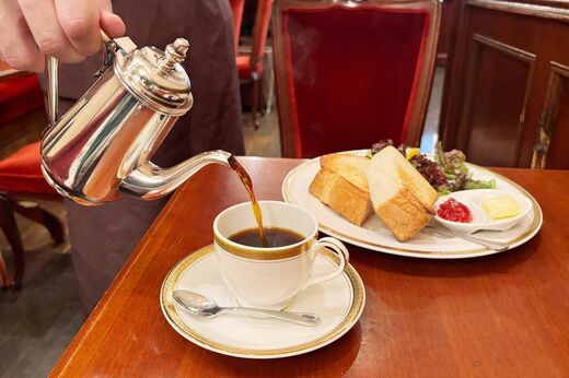 テーブルに空っぽのカップアンドソーサーがサーブされ、目の前でポットからコーヒーを注いでもらえるので、スペシャル感にグッときます。