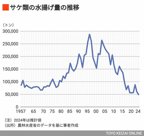 毎年のように今年はサケが不漁とか前年より何割増えた、もしくは減ったという報道があります。年によってはサケの水揚げ量が前年比で何割増などというニュースが出ます。しかし、サケに限らず、すっかり水揚げ量が低迷していることを伝えず、前年比だけを強調すると、水産資源が大幅に回復したのでは?と誤解させられる場合があります。