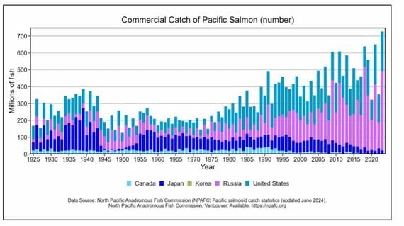 次のグラフは、太平洋におけるシロザケ、カラフトマス、ベニザケなどのサケ類の漁獲量推移を示しています。紺が日本、青緑がアメリカ(主にアラスカ)と紫がロシアです。日本は減り続けているものの、アメリカとロシアは凸凹があるにせよ減少どころか増加傾向であることがわかります。