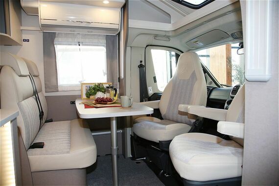 一方、室内は、明るい雰囲気を演出するとともに、必要最低限ながら豪華で快適な装備を持つことが特徴だ。車体右側のエントランスから室内に入ると、ぱっと目に入るのがテーブルやソファーを備えたダイネット。停車時に運転席と助手席を180度後方へ回転させれば、大人4名がくつろげるスペースとなる。運転席などのシート類は、レザーとファブリックのコンビ仕様で、アイボリーの色調が清潔感のある雰囲気を醸し出している。
