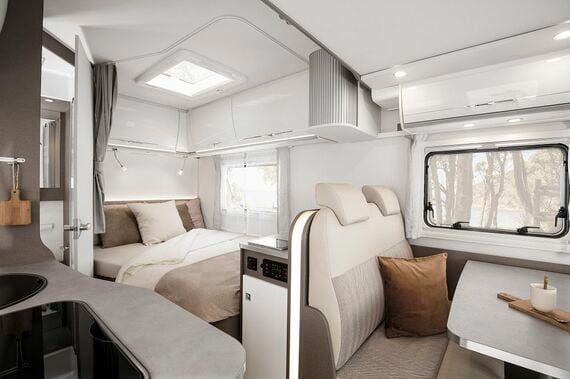 T5900FBでは、ほかにもエントランスの左側にキッチンを装備する。ガラストップ付きのステンレス製シンクや2口バーナーコンロ、78Lの冷凍冷蔵庫などを標準装備。オプションで電子レンジも用意しており、キャンプ場など出先でさまざまな調理も可能だ。