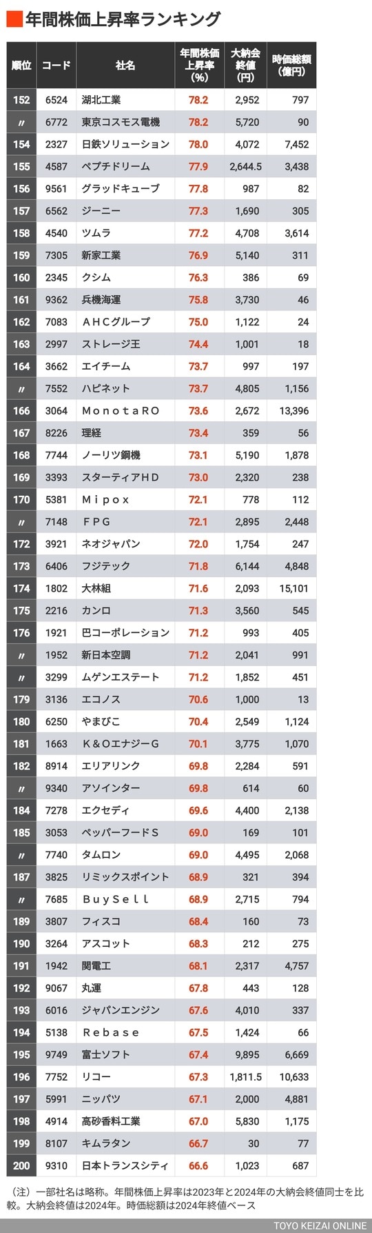 政治・経済・投資 首位1947%「2024年の株価上昇率」トップ300社 89社が年間で株価上昇率が100%以上になった 1分で読める 公開日時:2025/01/07 06:00 東洋経済オンライン編集部 フォロー 1/7 PAGES 2/7 PAGES 3/7 PAGES 4/7 PAGES 5/7 PAGES 次は152~200位 次ページが続きます 6/7 PAGES 7/7 PAGES