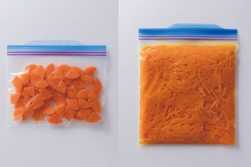 にんじんはβカロテンも豊富で、栄養価がとても高いので、ぜひ積極的に料理に取り入れてほしい野菜です。大きくカットして冷凍すると、どうしても食感が悪くなるため、薄く切ったり、下味をつけたりして冷凍するのがおすすめです。