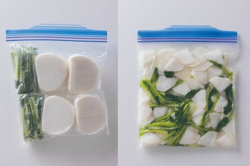 白い部分は薄いいちょう切りに、葉もよく洗って3〜4cmの長さにカット。塩もみし、出てきた水分ごと冷凍します。食べるときは保存袋ごと流水解凍すれば、かぶの漬物に!