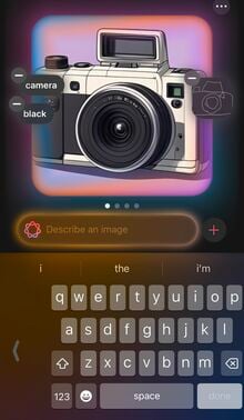 次に、そのイラストを説明するためのキーワードを入力する。試しに一眼カメラ(に見えなくもない)のイラストをサッと線で描き、追加のワードには「camera」と入力してみたところ、線画に沿った形でイラスト調のカメラが出力された。フラッシュのつもりで描いた部分も、ちゃんと画像に反映されている。画像下の入力欄に「black」を追加したところ、ボディの色を黒に変わった。