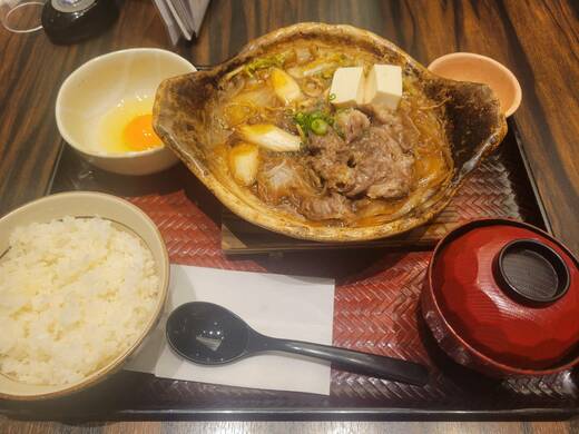 こちらが「国産黒毛和牛のすき鍋」の定食。メニュー写真では肉が赤くレアな状態に見えるが、写真上の演出のようで実際にはしっかりと火が通った状態で提供された。鍋もアツアツだ。