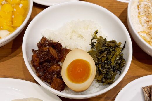 魯肉飯は、台湾の屋台で人気の丼料理です。「春水堂」の魯肉飯は、白米の上に甘辛く煮込んだ豚の角煮、煮卵、高菜が載っています。ご飯の量は200g(お茶碗1杯強)以上はありそうです。