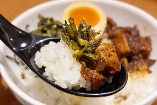 甘辛い角煮を、高菜漬けの酸味でさっぱりさせて、煮玉子がまろやかにまとめてくれます。