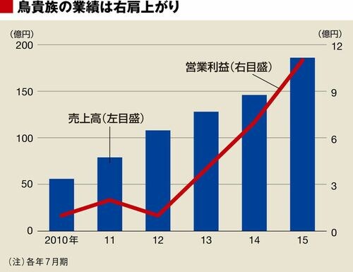 鳥貴族の最新決算である2015年7月期は売上高186億円(前年比27%増)、営業利益11億円(同61%増)と、いずれも過去最高を更新した。業績は右肩上がりで、それに伴って店舗網も拡大を続けており、今年8月末時点で直営228、FC189の417店を構え5年前からほぼ倍増している。