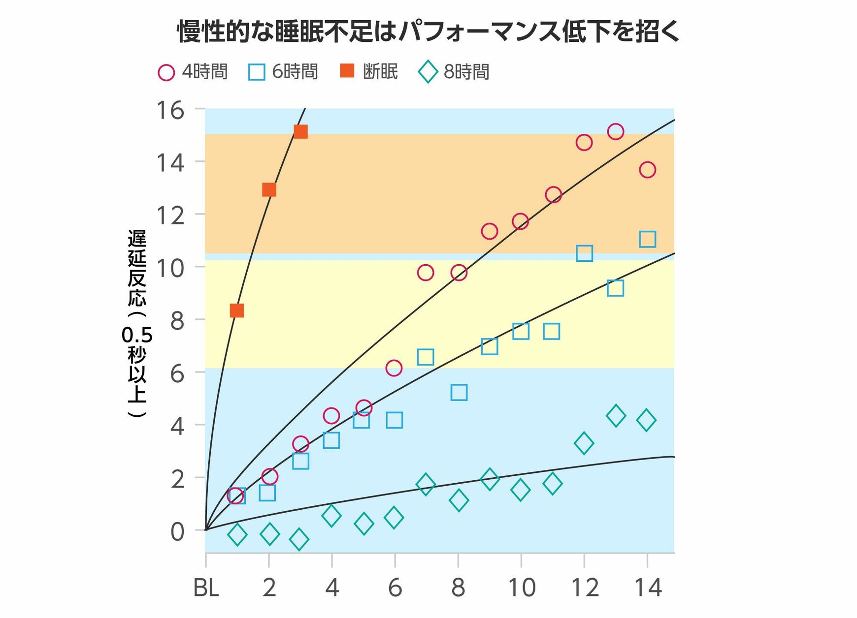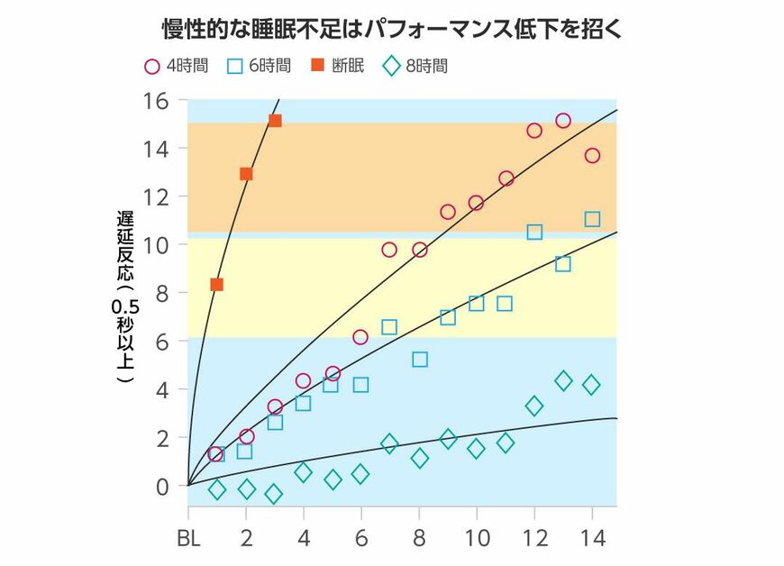 ランダムに提示される刺激に対して、0.5秒以上かかった遅延反応数を示したもの。毎日6時間の睡眠でも10日以上続くと一晩徹夜したのと同等レベルの遅延反応が生じた。睡眠不足が続くと仕事にも支障を来たす可能性が高くなる。(図:慢性的な睡眠不足とパフォーマンス低下の関係 出所:Hans P.A. Van Dongen,Greg Maislin,Janet M. Mullington,David F. Dinges [2003]『Sleep』)