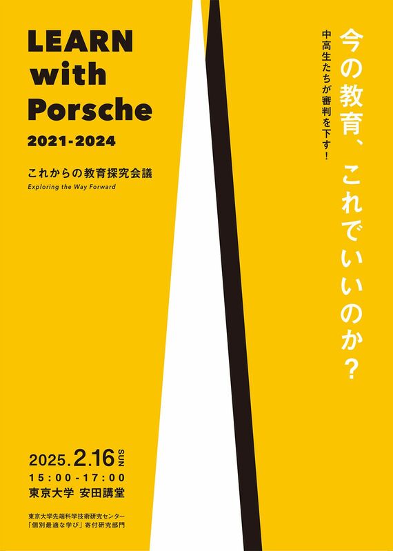 東京大学先端科学技術研究センター「個別最適な学び研究」寄付研究部門が運営する「LEARN」とポルシェジャパンは、2025年2月16日(日)に「これからの教育探究会議『今の教育、これでいいのか? 〜中高生たちが審判を下す!〜』」と題したイベントを東大の安田講堂で開催する。