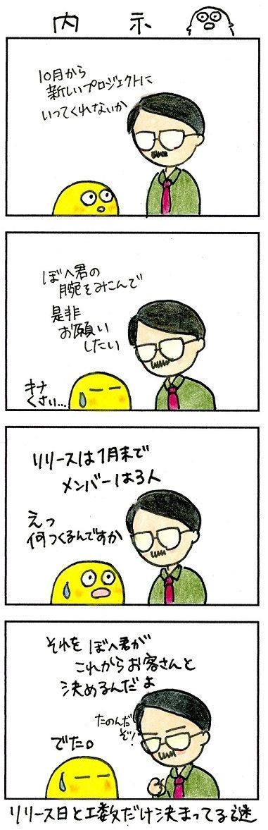 「ぼへ君の腕をみこんで、ぜひ10月から新しいプロジェクトをお願いしたい」「これまでのキミの働きを見て僕が強く推した人事なんだ」