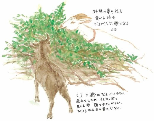 もし誰か他のヤギが先に駆け付けていたとしても、頭突きして追い払って最新の食事を一番に摂る。カヨは群れのリーダーなのだが、純粋な喧嘩では茶太郎に敵わないので、一歩引いた形で次点の立ち位置を確保する。