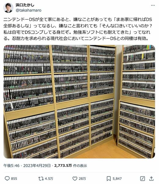 2023年4月、浜口さんは自身のXでニンテンドーDS“1840本”ものタイトルが並ぶコレクションの写真をアップ。