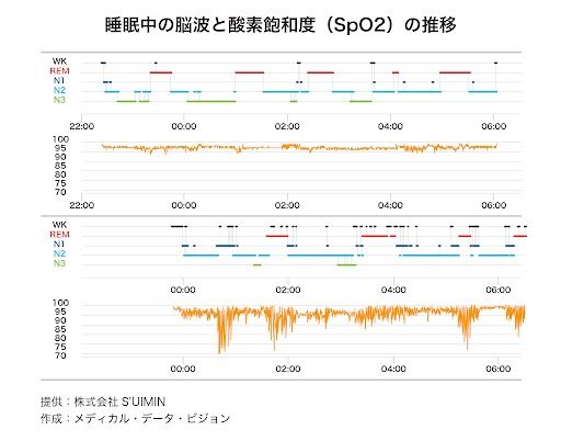 一方、客観的な睡眠の質とは、睡眠中の脳波の動きや血液中の酸素飽和度(以下、SpO2)の変化を測定してわかるものをいう。最近はこうしたデータから睡眠の質を「見える化」し、どのような睡眠をしているかを明確にしようとする取り組みがある。