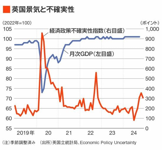英国の景気が再び停滞している。例えば、2024年7〜9月期の実質GDP(国内総生産)の確定値は前期比横ばいと、速報値の同0.1%増から下方修正された。また10月の月次実質GDPは前月比0.1%減と、9月(同0.1%減)に続いてマイナスとなっている。