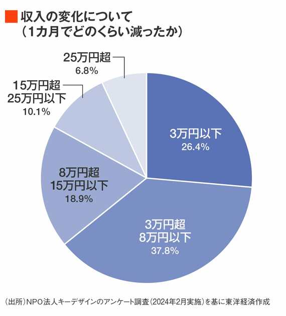 また、離職や休職、早退・遅刻・欠勤の増加は、当然家計を圧迫することになる。2月調査では約4割の回答者が「収入が減った」「収入がゼロ・ほぼゼロになった」と答え、このうち8万円以上減った家庭も4割弱に及んでいる。