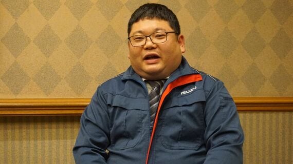 いすゞ自動車が昨年発売した小型トラック「エルフミオ」で、商品マーケティングに携わった野原陽二さん(記者撮影)